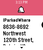 A simple but useful utility for tracking where you parked and if you locked your car. You can set the stall (letter/number) with the up down keys, get your GPS translated to an address, address by IP address and now supporting notifications so your time and parking is stored in your latest pebble notifications.