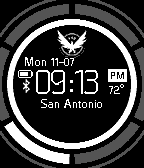 The Division watchface for APLITE, BASALT, AND DORITE. Displays day of week, month, and day of month, battery level, bluetooth connectivity, city/location and current weather in Fahrenheit.