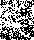 Very basic analog watchface, showing hour and minute hands, with a dog as the watchface background