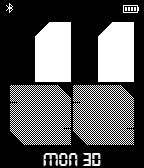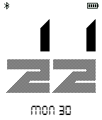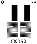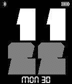 Stylish bold font face showing time, weekday and date. Features: -Setting free -12/24 hr display based on system setting -Battery level indicator -BT connection indicator -BT disconnect vibration and watchface color inverting