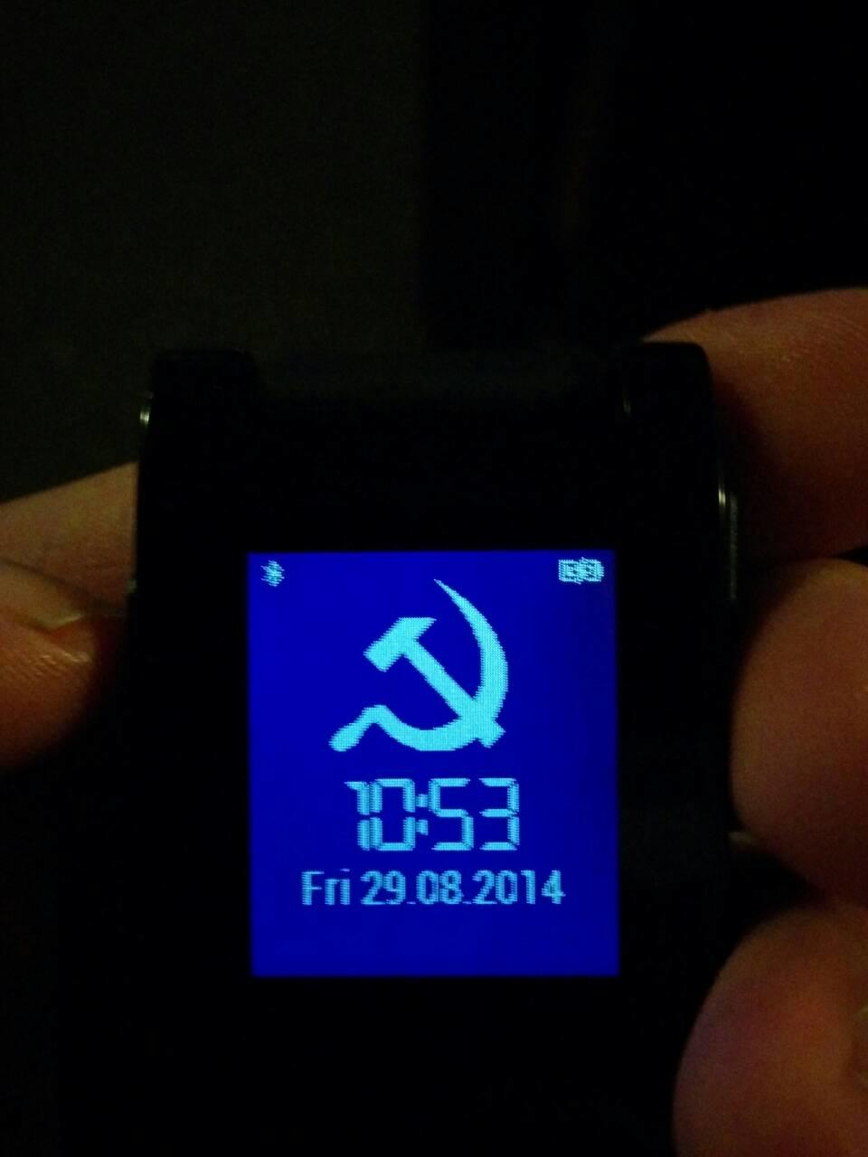 simple watch face with Vladimir Putin as the background. Battery indicator as well. Does invert colors when Bluetooth is disconnected