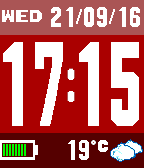 English, Français, Deutsch 90 degrees. Date : dd/mm/yy (european style) Temperature in degrees Celsius Bluetooth unconnected indicator Battery level 12h / 24h For those like me who like wearing their watch under the wrist. Update weather every hour from http://openweathermap.org Français 90 degrés. Date: jj/mm/aa Température en degré celcius Bluetooth déconnecté Niveau de la pile 12h / 24h Pour ceux qui comme moi portent leur montre sous le poignet. Récupération de la météo à toutes les heures sur http://openweathermap.org Deutsch 90 Grad. Datum: TT.MM.JJ Temperatur in Grad Celsius Bluetooth unverbundenen Anzeige Batteriestand 12h / 24h Für diejenigen wie mich, die ihre Uhr unter dem Handgelenk tragen wollen. Aktualisieren Wetter stündlich von http://openweathermap.org