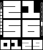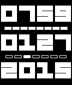 Semi-abstract watchface. Hour displayed numerically in middle (24-hour format supported). Squares surrounding hour displays minutes. Big squares for every ten minutes, small squares for every one. Time displayed in screens: 7:48, 7:49, 7:50. Date displayed below hour. Battery indicator at top of screen. Full bar = fully charged. Each medium segment = 30%. Each block = 10%. 80% displayed in screens. Bars hollow out when charging (2nd screen). Month indicator at bottom of screen. Will hollow out on Bluetooth disconnect (except current month). Vibrates on Bluetooth connect/disconnect.