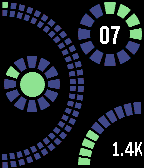 Circular abstract watchface. Concentric circles tells time. Fills clockwise until halfway, then diminishes until empty. Outer ring displays hours. Each segment represents a hour. Empty ring12 AM (midnight), full ring 12 PM (noon). Second ring displays tens of minutes. Each segment represents ten minutes. Empty ring :00, full ring :30. Third ring displays ones of minutes. Each segment represents one minute. Empty ring :00, full ring :05. Fourth ring displays battery level. Full ring 100%, diminishes clockwise as battery depletes. Center displays Bluetooth connection. Filled circle means connected, unfilled means disconnected. Semi-circle to left displays steps. Upper portion represents 1,000s of steps, lower portion 100s of steps. Day of the month in upper-right corner, day of the year in lower-right corner. Full color customization (6 options). Image #1: 9:56 PM, 7,100 steps, 50% battery, connected Image #2: 9:59 PM, 7,100 steps, 50% battery, connected Image #3: 10:01 PM, 0 steps, 80% battery, disconnected