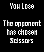 The game has only three possible outcomes other than a tie: a player who decides to play rock will beat another player who has chosen scissors ("rock crushes scissors") but will lose to one who has played paper ("paper covers rock"); a play of paper will lose to a play of scissors ("scissors cut paper"). If both players throw the same shape, the game is tied.
