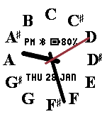 A simple analog watchface with a musical theme. Choose from the chromatic scale, the circle of fifths (major or minor), key signatures, or note values.