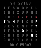 Shows the time in words from a fixed matrix of letters.