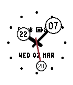 A simple analog watchface with the choice of Arabic, Roman, or dozenal numerals.
