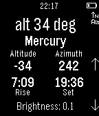 Track the solar system bodies without any internet connection! Can be used to find compass heading and inclinometer, whilst display current azimuth and altitude of a heavenly body. For moon rise and set times, please see 'Astronomy Face'.