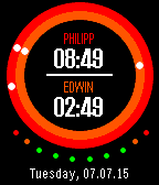 This is a paid watchface. You will get the first 24 hours free. --- Our take on a watchface with two timezones giving you many personalizing options too! The inner circle shows the time for the first timezone(in the above example for Philipp’s timezone) and the outer one stands for the second timezone (Edwin, in the above example). You will be able to choose your own timezone and give both of them a name.