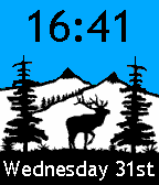 An elk in the woods. Date text colour changes depending on battery state. Charging or plugged in = Green Greater than 20% = White 20% or less = Yellow 10% or less = Red If any comments or issues let me know!