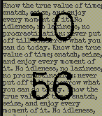 Simple digital watchface showing quote about time in the background, with time overlay. AM/PM indicated with triangles in top left and bottom right corners, respectively. "Know the true value of time; snatch, seize, and enjoy every moment of it. No idleness, no laziness, no procrastination: never put off till tomorrow what you can do today." -Philip Stanhope, 4th Earl of Chesterfield