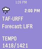 At-a-glance aviation weather on your wrist made by a pilot for pilots. This open-source watchface organizes and displays the METAR report for your favorite or nearest airport. Unlike some watchfaces which only display the raw text, we make sense of the data. This allows us to better arrange your report and even determine the current Flight Rules. Know immediately when your favorite airport is under VFR, MVFR, IFR, or LIFR. Header: Local time (12 or 24), ICAO station ID, Flight rules Row1: Current Zulu time, Issue time, Minutes since issued Row2: Wind direction, Wind speed including gusts (KT/MPS) Row3: Temperature (C), Dewpoint (C), Altimeter (InHg/hPa) Row4: Visibility (SM/km), Other WX Codes (ex: -SN, NOSIG) Row5: Bottom two cloud layers (ex: OVC020) Background behind "minutes since issue" will be red if the last fetch was not successful. Updated 2016-10-31: New AVWX endpoint, new menu icons Note: METARs come in two variants: International and North American. Both variants use different units for visibility and altimeter. While the altimeter value is easy to tell apart, visibility is not. Though the unit is not displayed on screen, an altimeter around 1000 will always have vis reported by km, and an altimeter around 29.92 will always have vis reported by SM. Some stations report wind speed in MPS rather than KT, but these units will always be displayed on screen.