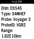 The Deep Space Network on your Pebble. Displays the dishes at various stations that are currently communicating with our deep space probes and the type of link (uplink/downlink). Cards also contain additional info about the dish and probe. Example: the second sreenshot shows dish DSS55 at Madrid, ES is currently uplinking to New Horizons.