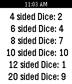 Shake or push any of the three buttons on the side to roll all 6 dice at the same time. 4 sided dice, 6 sided dice, 8 sided dice, 10 sided dice, 12 sided dice and 20 sided dice are displayed for each roll.