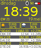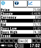 A watchface that gives you a glance to your personal financial world. Configure your portfolio decomposed of stocks and indexes. Have a look to your selection of exchange rates. Drill down to special stocks and indexes in regard to yearly lows and highs, dividend payments, actual trends and historical charts. Configure preconfigured/ individual RSS/ ATOM feeds or google alerts for information purposes.