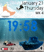Sitting in boring meetings, a train or on a long trip with a bus you can watch the scenario of a deep blue see alias fish tank. The "actors" change a little all over the day. Due to this it remains interesting. The lead is assigned to a big white shark. ;) Also the current weather for a fix selected or per GPS detected location is shown in addition to the current date in nearly any language. An intelligent algorithm controls the activity to take the charging level of the battery into account.