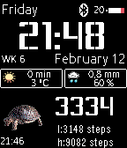 Pebble steps into the health market by providing a health monitoring. Under the cover – assuming the function is enabled in the pebble health app settings – algorithms detect steps, more vigorous movements resulting in a higher VMC value, sleep as well as restful sleep phases. Also active as well as retful calories consumption are tracked. The new Watchface provides all this data to you put into configurable graphs. It’s up to you, what values over the time are interesting for you. In particular the step count over the day is shown rated by a (funny) icon showing you e.g. a fat cat sitting in front of its TV, in case a low step count was measured. ;) In addition the weather of your current location or a preconfigured fixed location is always shown. Also the time, the date in nearly any language is provided. Russian support was added lastly.