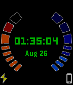 Q-Watch Color Digital is based on the famous Q-Watch v2.01 Beta, but instead of an analog clock, it has the current time and date. The left bars indicate the battery status, and the right bars indicate the bluetooth connectivity status with the Pebble phone app.