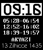 Bulunduğunuz konuma göre günlük namaz vakitlerini ve hicri olarak günü gösteren saatyüzü uygulamasıdır. İmsak-Güneş Öğle-İkindi Akşam-Yatsı Namaz vakitleri yukarıdaki gibi listelenmiştir. Program 3 günlük namaz vakitlerini kaydeder ve internetiniz olmasa bile göstermeye devam eder. Belli zaman aralıklarında da kendini otomatik günceller.