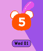 Teddy bear tells the time. Teddy's face shows the hour in numerals, and a hand points to the minutes. Backgrounds colour pairs changes on the hour. E.g. the screenshot would be 5:04 (i.e. 5 o'clock as indicated by the number in Teddy & the colour pie, ~4 minutes as pointed by the 'minute' hand. Credits: Thanks to animation code from OldFogies.