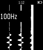 Shows continuous vertical graphs for each of the 3 accelerometer axes. Use up/down to adjust sampling rate, press select to magnify the amplitude.