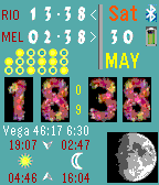 The Pro version of this watch app shows: - local time (hours, minutes and seconds) using one of nine different fonts; - times of two cities in the world and symbols that indicate if the time is forward or backward with respect to the local time; - local date (weekday name, day number, name of the month); - binary digit clock (hours, minutes and seconds); - month, weekday name and greetings in five languages (English, Italian, German, French, Spanish); - greetings for five stage of the day; - local times for sunrise, sunset, moonrise and moonset; - 24 true images of the moon, according to its phase; - status indicators for battery and bluetooth; - after sunset and before sunrise: local altazimuthal coordinates of 28 bright stars. Lite version limits: - Only english language; - Only timezone of Rio de Janeiro and Sydney; - Local coordinates with step of 5 degrees; - Binary clock only for 5 minutes of every hour, then it only shows hours; - Altazimuthal information about only 7 stars. More information at http://www.goldnewty.it/GoldNewty_Apps/AstroBinClock.html