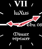Classic minute repeater with battery status and BT connection indicator hidden in the 9-marker (turns red on lost BT). With a flick of the wrist the watch tells you the time with a discrete vibration pattern : First a series of long vibes per hour Next a series of double vibes per quarter And last a series of short vibes per minute The minute repeater function can be disabled. Convenient night mode option for low light operation. Extremely battery friendly.