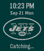 Jets Pebble Time Watchface that tells you the weather, time in 12hr format and the month, day, and day on the week. In jets colors.