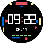 A Pebble Time Round watchface inspired by the Bauhaus design movement (1919-1933), featuring geometric forms and the classic Bauhaus color palette. Features Design Elements • Geometric Digits: All numerals are drawn using pure geometric primitives (rectangles only) • Bauhaus Color Palette: Classic red, yellow, and blue geometric shapes on black and white • Dense Composition: Screen filled with colored geometric symbols - rectangles, squares, and triangles • No Curves: Pure angular geometry - no circles or arcs that would pixelate on low-res display • Battery Indicator: Five horizontal bars at bottom with dynamic colors: - Green (4-5 bars): High charge (60-100%) - Yellow (2-3 bars): Medium charge (20-60%) - Red (0-1 bars): Low charge (0-20%) • Decorative Elements: - Corner accents in all four corners (triangles and squares) - Vertical composition on left side (rectangles and squares) - Asymmetric composition on right side (rectangles and triangles) - Top and bottom horizontal elements (bars, triangles, squares) - Square colon separator in primary red Configuration Options Access settings through the Pebble app: Time Format - 24 Hour (default) - 12 Hour Date Format - German: "24 JAN" (default) - US: "JAN 24" - Numeric: "24.01" - Numeric: "01/24" - ISO: "2026-01-24" Color Scheme - Full Color: Red/Yellow/Blue accents on black (default) - Minimal: White background with single red accent - Inverted: Colored elements on white background
