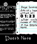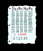 When Light needs his Death Note Slip, this is where he gets it in 2016. On the pebble smartwatch. This is a small piece of note book paper I made on pixel art with a bunch of names from the criminals Light kills. This took me less time to make than the last on because I could use 7/8 of the note book from the last image I made. So here it is the new death note. Tags: color black and white note book notebook text small seconds minutes hours time pebble basalt aplite new L death note
