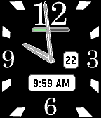 It has always bothered me that watch hands on a rectangular watchface are a varying distance from the edge of the face. This watchface grows and shrinks the hands dynamically so that they are always the same distance from the edge of the face. In the case of the minute and second hands, they reach all the way to the edge. The hour hand grows and shrinks to keep a constant 35 pixels from the edge of the screen. There are several configuration options: - Whether or not the second hand is drawn. - Start and end hours for the second hand to be drawn. - Colors for the second hand. - Whether a battery status indicator is drawn. - Whether a date window is drawn. - Whether the digital time is drawn. - Colors of the day/digital time windows. - Dark and light themes. I will also be looking at options to keep the date window from being obstructed by the minute and hour hands.