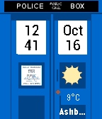 Tardis inspired WatchFace for Pebble. Features: - Time/Date - Vibration on BT connection loss - Weather information from openweathermap.org Time => upper left Date => upper right BT => left door Please send me any suggestions or questions to help me imporve this WatchFace.