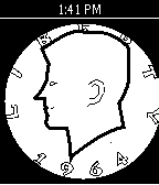 Flip a half dollar on your wristwatch by pressing the top button. The app keeps track of how many heads and tails there are. You can reset this to zero at any time. It also shows you your last flip result. The bottom button clears the heads/tails count. The middle button can be used to select four different coins. 1) 1964 JFK cartoon coin 2) 1917 Type 1 Standing Liberty 3) 1916 mercury dime