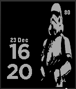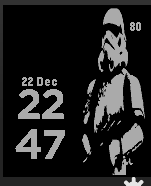 Stormtrooper watch face with Date, Bluetooth connection icon, and battery percentage.