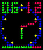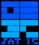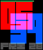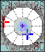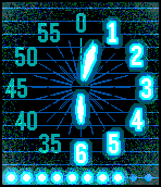 Analog style watchface on a pixelated background. The blue reticle points to the hours, the red to minutes -- it's 5:47 in this example. Date and battery status are intentionally obscure but readable in the corners.