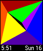 An analog watchface hidden in plain sight. The three vertices of the black triangle are the center of the watch, the hour hand, and minute hand -- in the first screenshot the time is 8:27. Even when the hour and minute hand align, the other triangles point to them to reveal the time -- the second screenshot is 9:15 and the third is 6:30.