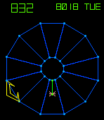 Analog+digital watchface in the style of a hit 1981 video game. The position of the player's ship indicates the hour. The enemy's position indicates 5 minute intervals, and the length of the spike indicates the remainder of the minutes. The score (top left) is the time, and the high score is the battery charge (80% in the screenshot) and current date (Tuesday the 18th).