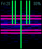 A slightly unusual watchface. The number of horizontal pink lines represent hours; vertical green lines in the top half are tens of minutes, and in the bottom half are single minutes. Lines are clustered/spaced to make them easy to recognize at a glance instead of tediously counting them. The example given is 5:51.