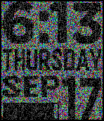 A simple watchface where the text is made from dark monochrome noise, and the background is made from bright colorful noise. Battery bar graph in lower left.