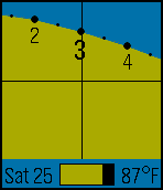 Represents the time as a sine wave, with midnight at the bottom of the curve, noon at the top, and zero crossings at 6AM and 6PM. Colors switch between day and night settings according to sunrise/sunset times from openweathermap.org. Also shows date, battery status and current temperature.