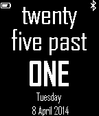 A watch face for those who dont need the exact time. So here we have a watch face that tells the time in words to the nearest five minute period (so you get 'five past', 'ten past' etc etc). Also shows battery level, bluetooth connection status and current day and date.