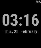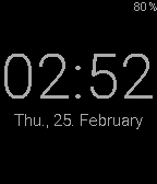 Light Digits by the Roboto-Light-Font from Android. A bit thicker and better readable than in my Android Thin watchface. Only Black&White. - Time (12 and 24h) - Date (Language depends on Language-Settings in the Pebble-App) - small battery indicator in percent