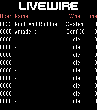 Livewire is an old school telephone entertainment system in Phoenix Arizona. This app will display who is currently on the system. It updates every minute and can be refreshed manually by hitting select. For a free user code call: 602.275.2227