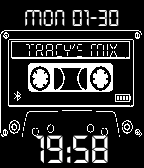 80's style, cassette mixtape theme with the date, time, bluetooth connectivity and pebble battery life.