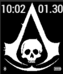 Based on the infamous "Calico" Jack Rackham's Jolly Roger. Date, time, battery and BT. Inverts on lost connection.