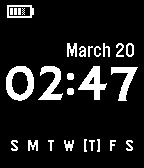 Simple watchface including current day and battery indicator. Vibrate when bluetooth connection is changed (lost or reconnected). When bluetooth connection is off, an exclamation mark is displayed instead of clock's middle colon. Hour format is 12/24h according to watch settings.