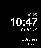 A simple watchface using the beautiful font Glober. See the time, date, battery level, and weather. The battery level can be hidden, and the weather can either be shown all the time or when you flick your wrist. The battery level changes colour as it charges/discharges.