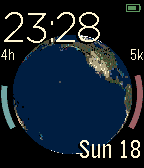 Watchface with a view of earth as a spinning globe. featuring smooth animations of the rotating globe. Follows the sun around earth. Spin the globe with a flick of the wrist. The direction of the flick controls the direction of the spin. Your position on earth is show with a blinking dot. Option to show daily sleep and steps.