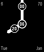 Combination digital and analog watchface. Minute and hour hands bear minute and hour digital values respectfully. Number in the middle is day of the month. Also featuring: Day of the week, month, battery percentage and Bluetooth connection status. Based on original concept by Zeduaz Smart. Started as Simple Analog face from Pebble SDK Demos.